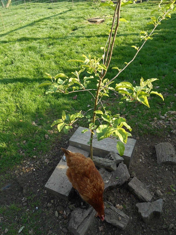 So we planted them outside in the ground.  We thought the chickens might like them for shade when they’re bigger, but while they’re still young we put some wood around them to keep the girls from scratching the earth off their roots.  There’s four in here (I wonder if you’ll be able to spot them all), and two of them are taller than me!  The 8 to 10 years wikihow said we’d have to wait for fruit seemed like a long time, but it’s been 3 years already and time’s just flying 😀