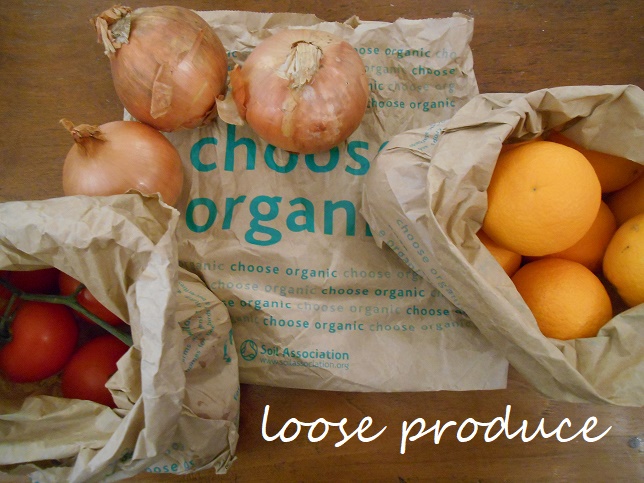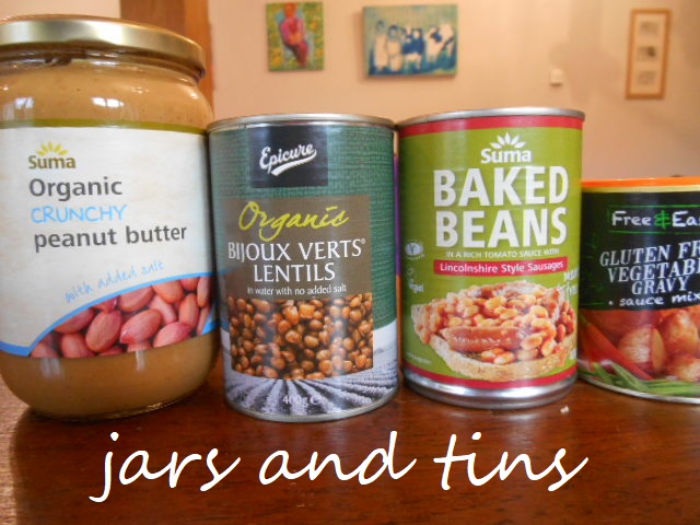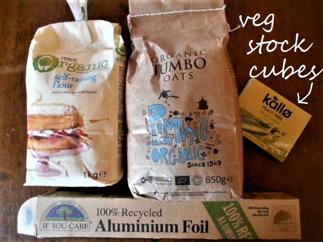 As for other necessary staples – you can probably get most of them in glass jars or tins.  We used to buy lentils, sultanas, pasta, tofu, cereal etc etc in plastic packets because we thought we couldn’t avoid it, but now we’re getting our lentils in tins and we’ll manage without cereal, pasta and dried fruit.  We buy organic oats in paper bags and I’ll mix them with fresh fruit for my breakfast instead of sultanas.