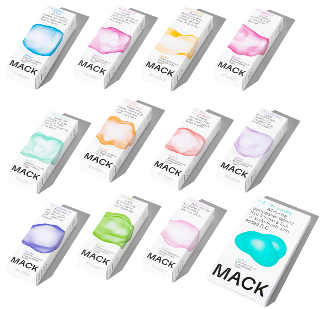 Mack! Keep it Mack with vegan, plastic-free sachets (biopods) of soluble detergents to which you add water. Everything you need to clean toilets, sinks, floors, hard surfaces, drains and to get rid of limescale. No need to buy any more plastic bottles BUT save the ones you’ve already got for refilling with these lifesavers! Also these products smell great and they’re easy on your wallet.